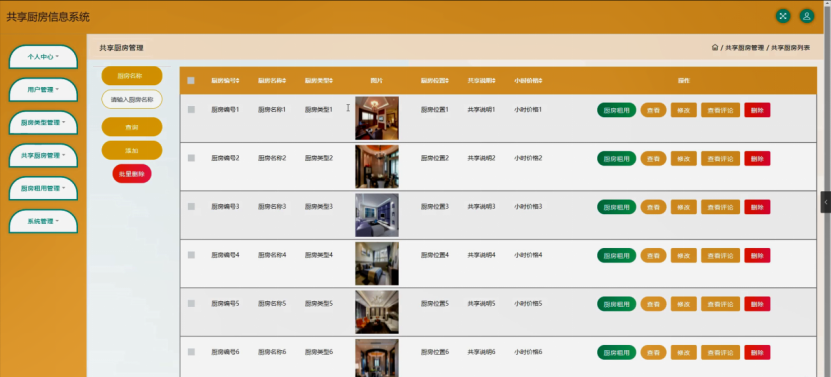共享厨房管理,在共享厨房管理页面可以对厨房编号、厨房名称、厨房类型、图片、厨房位置、共享说明、小时价格等内容进行厨房租用,查看,修改,查看评论或删除操作,如图5-9所示。