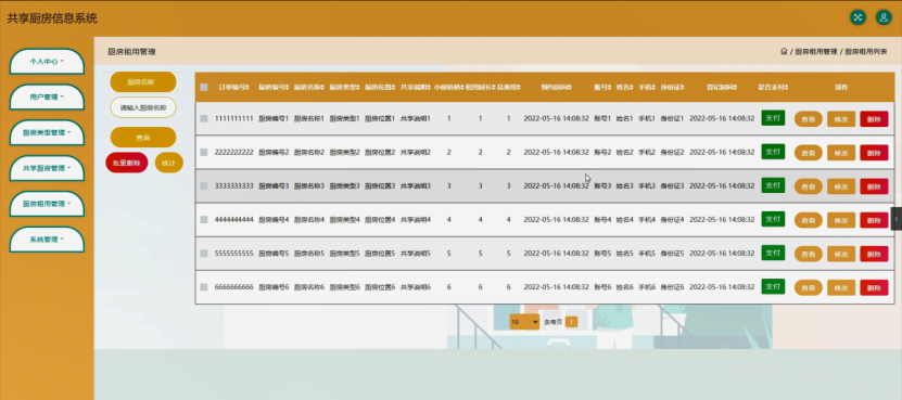 厨房租用管理,在厨房租用管理页面可以对订单编号、厨房编号、厨房名称、厨房类型、厨房位置、共享说明、小时价格、租用时长、总费用、预约时间、账号、姓名、手机、身份证、登记时间、是否支付等内容进行查看,修改或删除操作,如图5-10所示。