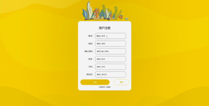 用户注册,在用户注册页面通过填写账号、密码、确认密码、姓名、手机、身份证等信息进行用户注册操作,如图5-2所示。