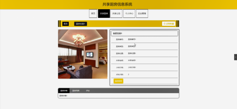 共享厨房,在共享厨房页面可以查看厨房名称、厨房编号、厨房类型、厨房位置、图片、共享说明、小时价格、点击次数、厨房详情,厨房用具等信息进行厨房租用,评论或收藏操作,如图5-3所示。