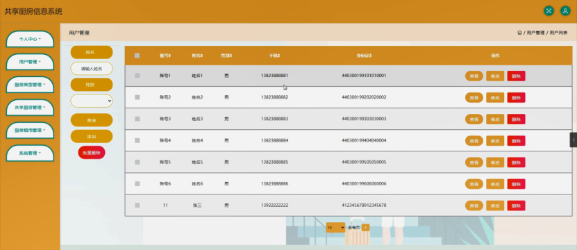 用户管理,在用户管理页面可以对账号、姓名、性别、手机身份证等内容进行查看,修改和删除操作,如图5-7所示。