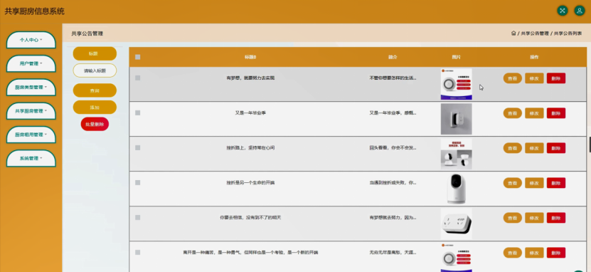 本系统主要包括管理员和用户两个角色;主要包括主页、个人中心、用户管理、厨房类型管理、共享厨房管理、厨房租用管理、系统管理等功能的管理系统。