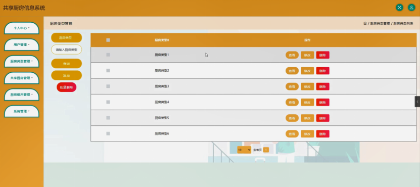 厨房类型管理,在厨房类型管理页面可以对厨房类型信息进行查看,修改和删除操作,如图5-8所示。