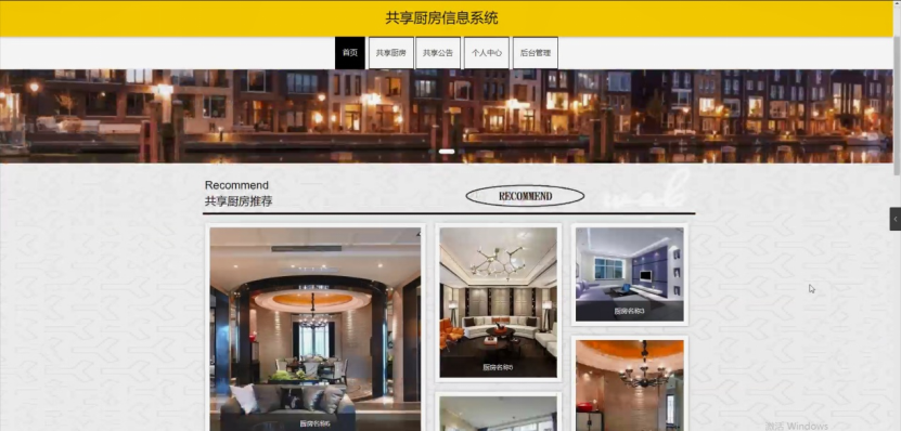 共享厨房信息系统,在系统首页可以查看首页、共享厨房、共享公告、个人中心、后台管理等内容,并进行详细操作;如图5-1所示。
