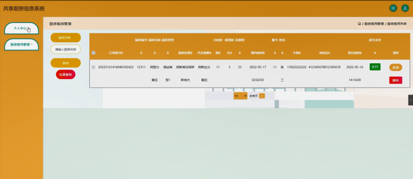 厨房租用管理,在厨房租用管理页面可以对订单编号、厨房编号、厨房名称、厨房类型、厨房位置、共享说明、小时价格、租用时长、总费用、预约时间、账号、姓名、手机、身份证、登记时间、是否支付等内容进行查看或删除操作,如图5-14所示。