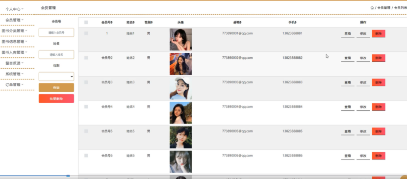 会员管理;在会员管理页面中可以对会员号、姓名、性别、头像、邮箱、手机等内容进行查看、修改或删除等操作;如图4-8所示。