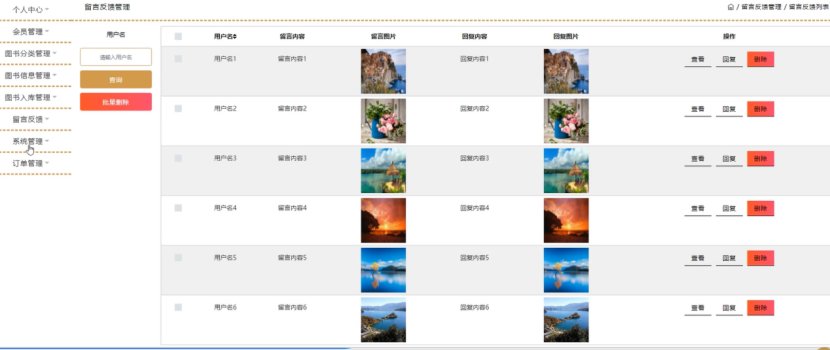 留言反馈;在留言反馈页面中可以对用户名、留言内容、留言图片、回复内容、回复图片等内容进行查看、回复或删除等操作;如图4-12所示。