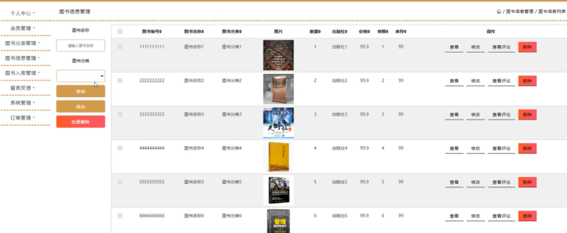 图书信息管理;在图书信息管理页面中可以对图书编号、图书名称、图书分类、图片、数量、出版社、价格、单限、库存等内容进行查看、修改、查看评论或删除等操作;如图4-10所示。