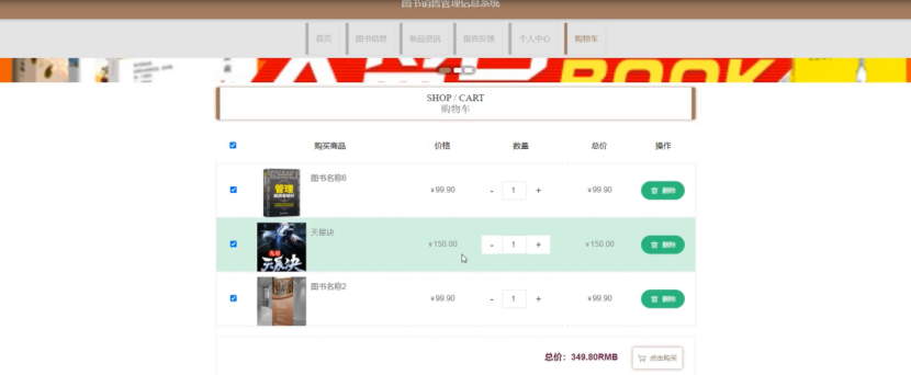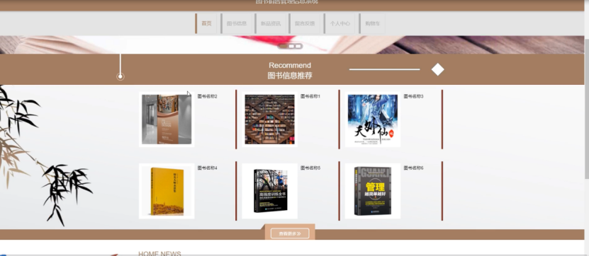 图书销售管理信息系统,会员进入到系统首页,可以查看首页、图书信息、新品资讯、留言反馈、个人中心、购物车等内容进行操作,如图4-1所示。