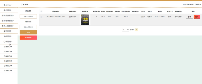 订单管理,在已订单支付页面可以对订单编号、商品名称、商品图片、购买数量、价格/积分、折扣价格、总价格/总积分、折扣总价格、支付类型、状态、地址、电话、收货人、商品类型等内容进行查看、发货或删除等操作,还可以对已完成订单、已发货订单、未支付订单、已取消订单、已退款订单进行相应的操作,如图4-14所示。