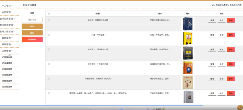 系统管理;在新品资讯管理页面中可以对标题、简介、图片等内容进行查看、修改或删除等操作,并可以根据轮播图管理进行相应的操作;如图4-13所示。