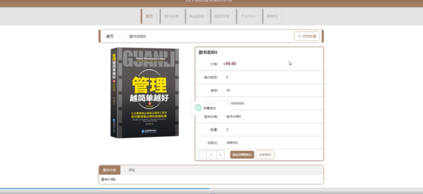 图书信息;在图书信息页面中可以查看图书名称、价格、单次购买、库存、图书编号、图书分类、数量、出版社等内容进行购买、评论或收藏等操作;如图4-2所示。