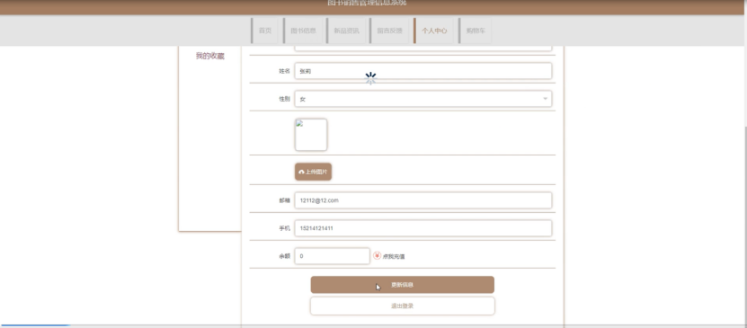 会员注册;在会员注册页面中输入会员号、密码、确认密码、姓名、邮箱、手机等内容进行会员注册操作;如图4-3所示。在个人中心页面中输入会员号、密码、性别、姓名、邮箱、手机、余额等内容进行更新信息等操作,并可以根据我的订单、我的地址或我的收藏进行相应的操作,如图4-4所示。
