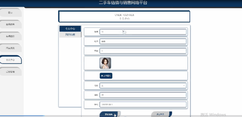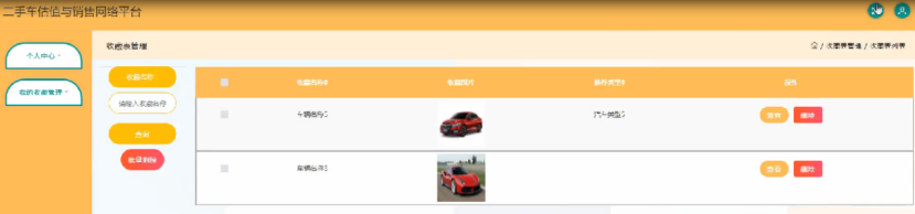 客户登录进入二手车估值与销售网络平台可以查看个人中心,我的收藏管理等功能进行详细操作,如图4-10所示。