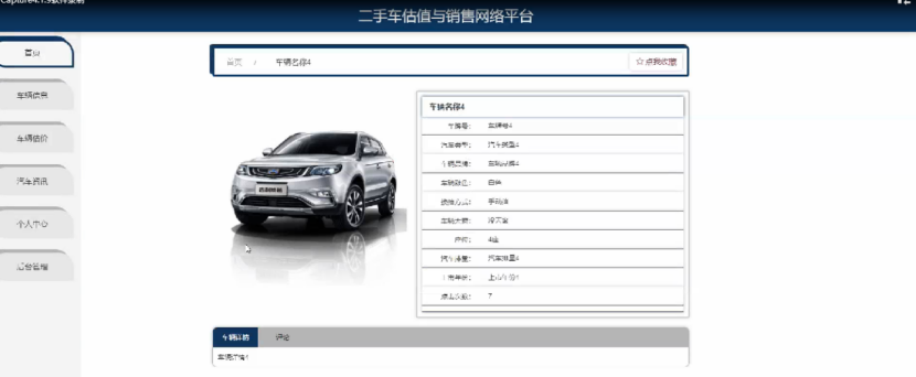 车辆信息;在车辆信息页面中可以查看车辆名称,车牌号,汽车类型,车辆品牌,车辆颜色,换挡方式,车辆天窗,座位,汽车排量,上市年份,点击次数等内容;并进行评论或收藏操作,如图4-3所示。