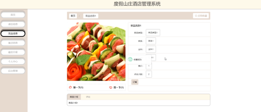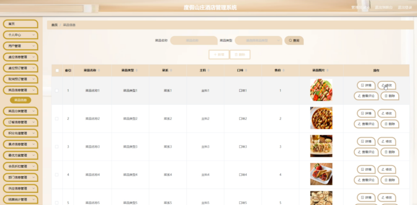 酒店菜品管理包括酒店菜品编号、名称、类别、图片内容信息。其中酒店菜品管理如下所示。