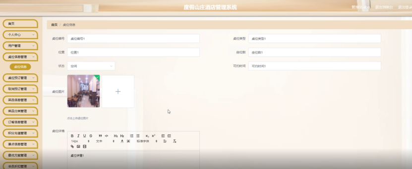 桌位管理包括编号、名称、类别、图片内容信息。其中桌位管理如下所示。