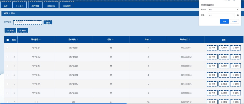 用户管理,在用户管理页面可以对索引、用户账号、用户姓名、性别、年龄、联系电话等内容进行详情、修改或删除等操作,如图5-7所示。
