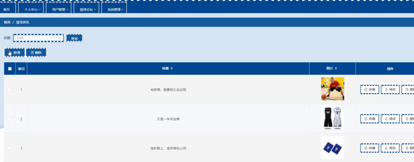 系统管理,在篮球资讯页面中可以对索引、标题、图片等内容进行详情、修改或删除等操作,并可以根据轮播图管理进行相应的操作,如图5-9所示。