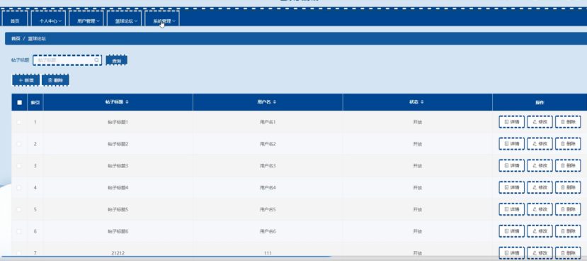 篮球论坛,在教师管理页面可以对索引、帖子标题、用户名、状态等内容进行详情、修改或删除等操作,如图5-8所示。