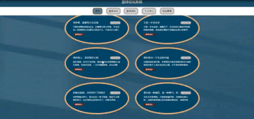 篮球论坛系统,在系统首页可以查看首页、篮球论坛、篮球资讯、个人中心、后台管理等内容,并进行详细操作,如图5-1所示。