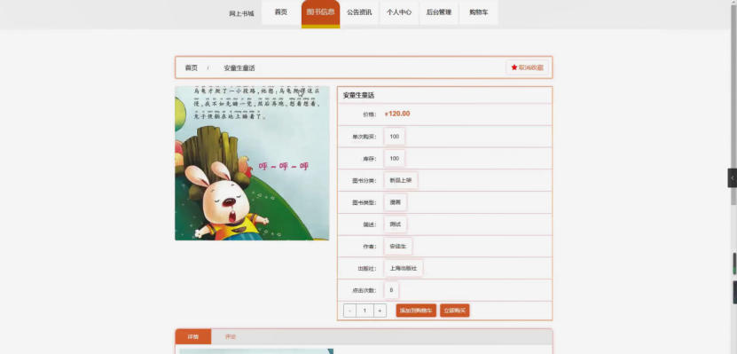 图书信息,在图书信息页面可以查看图书名称、价格、单次购买、库存、图书分类、图书类型、图片、简述、作者、出版社、点击次数、详情等详细内容,并进行添加到购物车、立即购买,评论或收藏等操作,如图5-3所示。