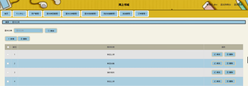 图书分类管理,在图书分类管理页面可以对索引、图书分类信息进行修改或删除等操作,如图5-10所示。