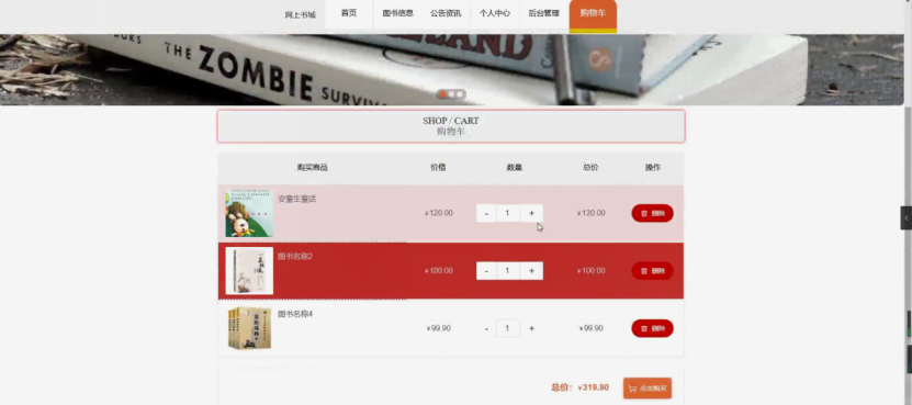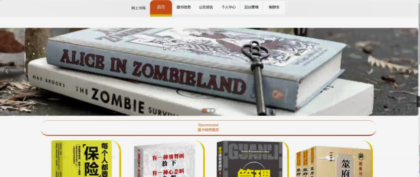 网上书城管理系统,在系统首页可以查看首页、图书信息、公告资讯、个人中心、后台管理、购物车等内容进行详细操作,如图5-1所示。