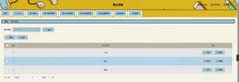 图书类型管理,在图书类型管理页面可以对索引、图书类型等信息进行修改和删除等操作,如图5-9所示。