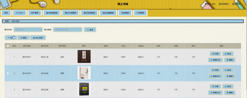 图书信息管理,在图书信息管理页面可以对索引、图书名称、图书分类、图书类型、图片、简述、作者、出版社、价格、单限、库存等信息进行详情,修改、查看评论或删除等操作,如图5-11所示。