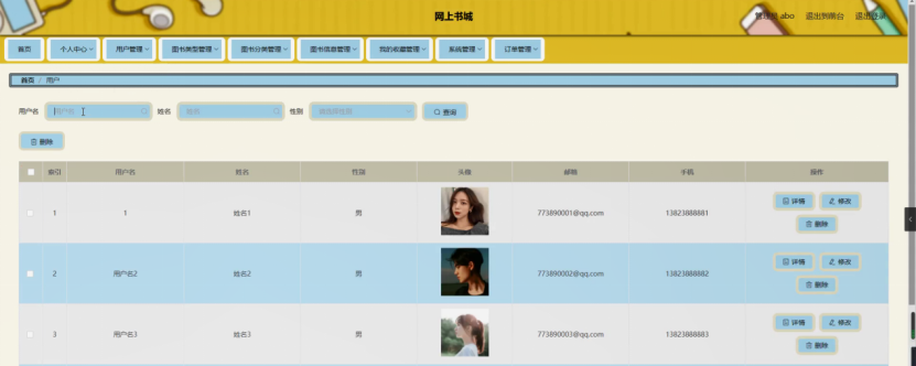 用户管理,在用户管理页面可以对索引、用户名、姓名、性别、头像、邮箱、手机等信息进行详情,修改或删除等操作,如图5-8所示。