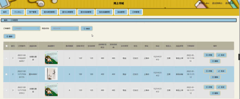 订单管理,在已支付订单页面可以对索引、订单编号、商品名称、商品图片、购买数量、价格/积分、折扣价格、总价格/总积分、折扣总价格、支付类型、状态、地址、电话、收货人、商品类型、下单时间等信息进行详情,发货或删除等操作,还可以对已退款订单,已完成订单,已发货订单,未支付订单,已取消订单进行相应的操作管理;如图5-13所示。