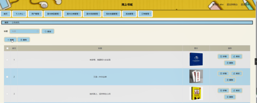 系统管理,在公告资讯页面可以对索引、标题、图片等信息进行详情,修改或删除等操作,还可以对轮播图管理进行详细操作;如图5-12所示。