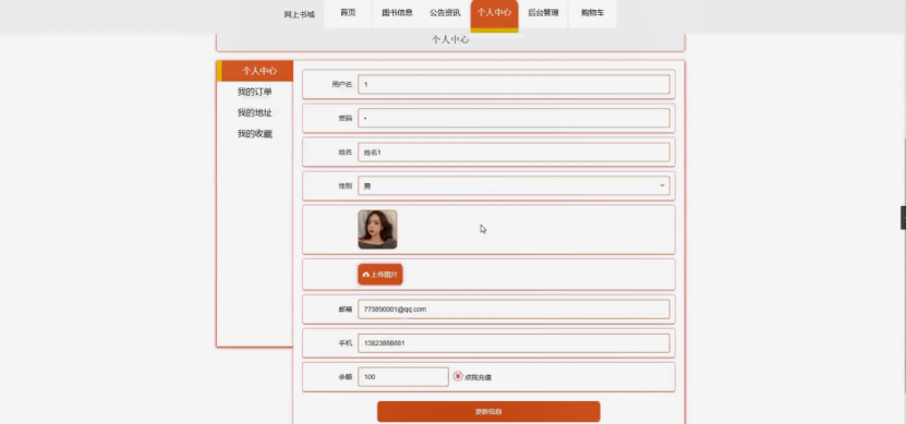 个人中心,在个人中心页面通过填写用户名、密码、姓名、性别、上传图片、邮箱、手机、余额等内容进行更新信息,根据需要对我的订单,我的地址、我的收藏进行相应的操作管理,如图5-4所示。