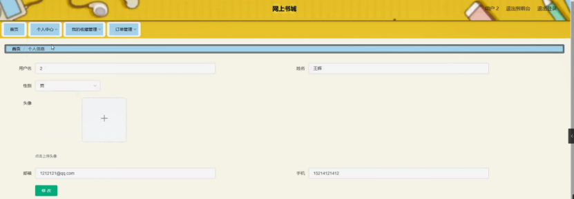 个人中心,在个人信息页面通过填写用户名、姓名、性别、头像、邮箱、手机等信息进行个人信息修改操作,如图5-15所示。