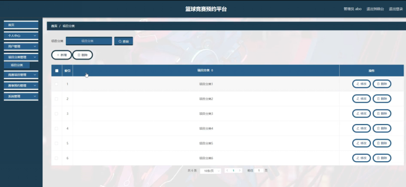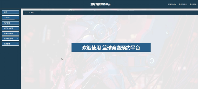 管理员登录进入篮球竞赛预约平台可以查看首页,个人中心,用户管理,项目分类管理,竞赛项目管理,赛事预约管理,系统管理等功能进行详细操作,如图4-7所示。