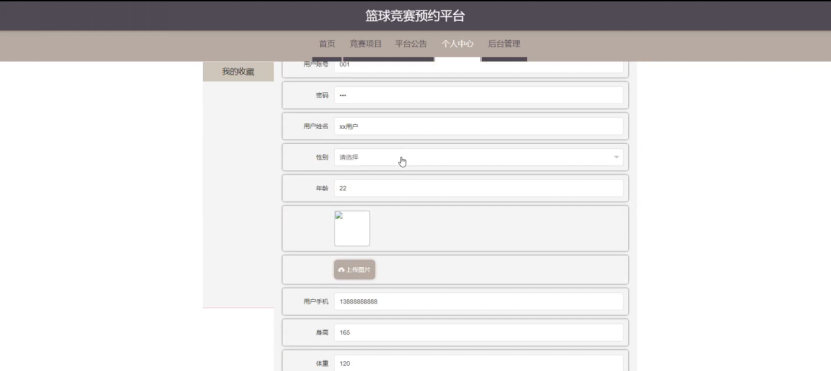 个人中心;在个人中心页面中输入用户账号,密码,用户姓名,性别,年龄,上传图片,用户手机,身高,体重等内容进行更新信息,并可以根据需要对我的收藏进行详细的操作管理,如图4-5所示。