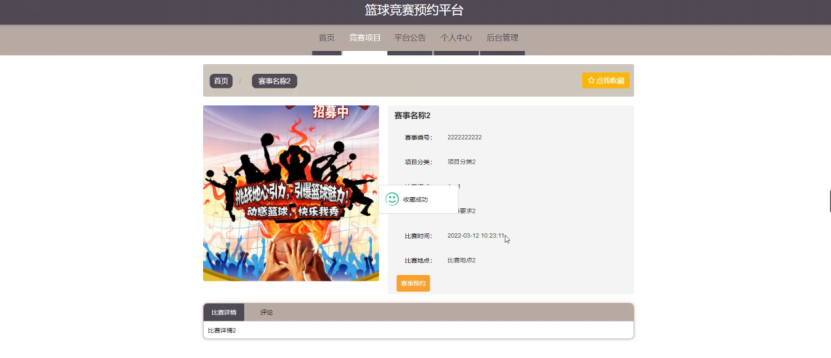 竞赛项目;在竞赛项目页面中可以查看赛事名称,赛事编号,项目分类,比赛模式,赛事要求,比赛时间,比赛地点,比赛详情、封面等内容;并进行赛事预约,评论,收藏操作;如图4-3所示。