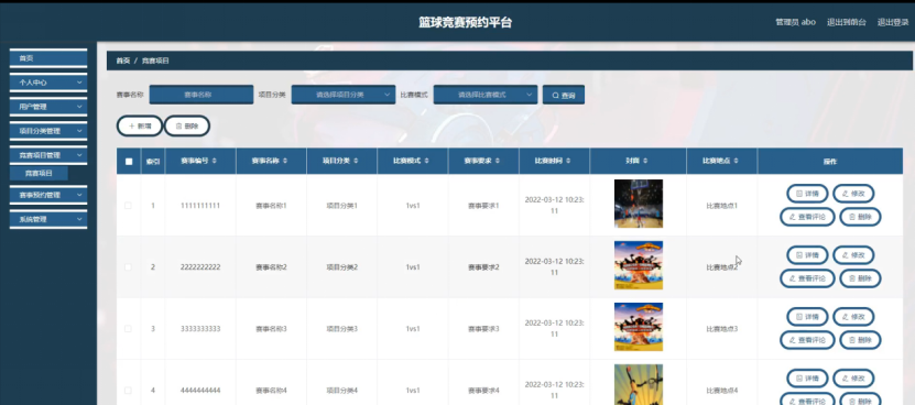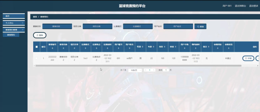 赛事预约管理;在赛事预约管理页面中可以查看索引,赛事编号,赛事名称,项目分类,比赛模式,比赛地点,比赛时间,用户账号,用户姓名,性别,年龄,身高,体重,用户手机,预约时间,备注,审核回复,审核状态,审核等内容,并进行详情,查看评论,修改和删除等操作;如图4-11所示。