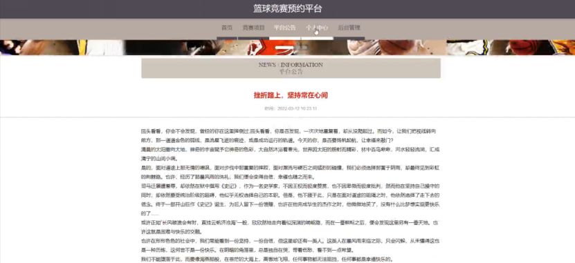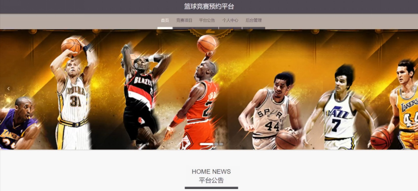 篮球竞赛预约平台,用户进入到平台首页,可以查看首页,竞赛项目,平台公告,个人中心,后台管理等内容进行操作,如图4-1所示。