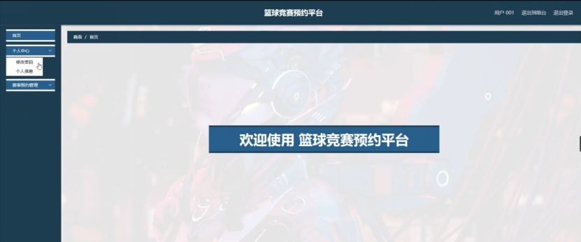 用户登录进入篮球竞赛预约平台可以查看首页,个人中心,赛事预约管理等功能进行详细操作,如图4-13所示。