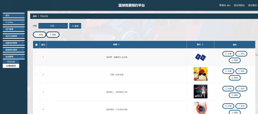 系统管理;在平台公告页面中可以查看索引,标题,图片等内容,并进行详情,修改和删除等操作;还可对轮播图管理进行详细操作;如图4-12所示。