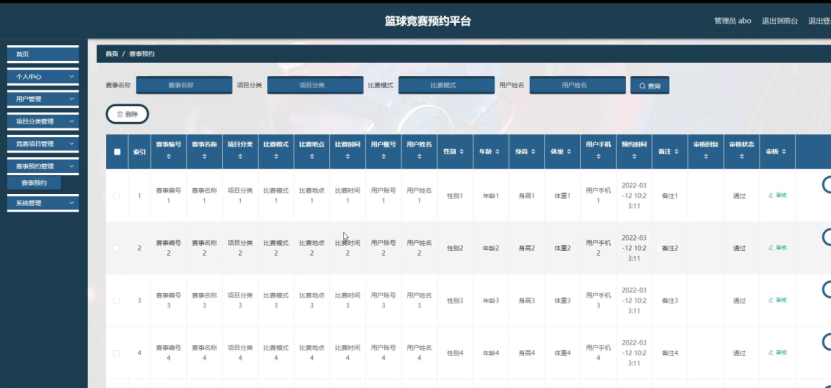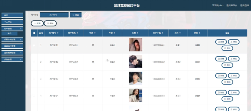 赛事预约管理;在赛事预约管理页面中可以查看索引,赛事编号,赛事名称,项目分类,比赛模式,比赛地点,比赛时间,用户账号,用户姓名,性别,年龄,身高,体重,用户手机,预约时间,备注,审核回复,审核状态等内容,并进行详情,删除等操作;如图4-15所示。