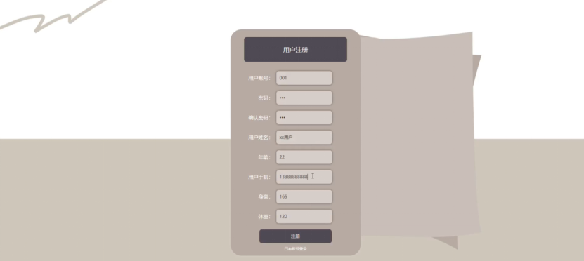 用户注册;在用户注册页面中输入用户账号,密码,确认密码,用户姓名,年龄,用户手机,身高,体重等内容进行用户注册操作;如图4-2所示。