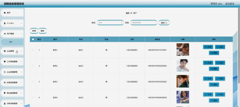 用户管理,在用户管理页面可以对索引、账号、姓名、性别、手机、身份证、头像等信息进行详情,修改和删除等操作,如图5-8所示。
