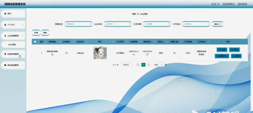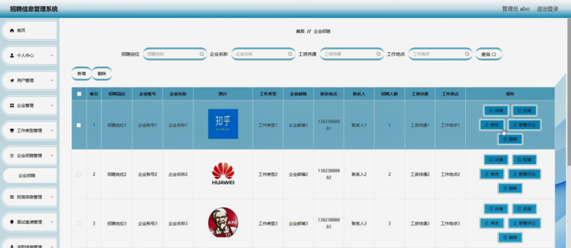 企业招聘管理,在企业招聘管理页面可以对索引、招聘岗位、企业账号、企业名称、图片、工作类型、企业邮箱、联系电话、联系人、招聘人数、工资待遇、工作地点等内容进行详情,投简,修改,查看评论或删除操作,如图5-10所示。
