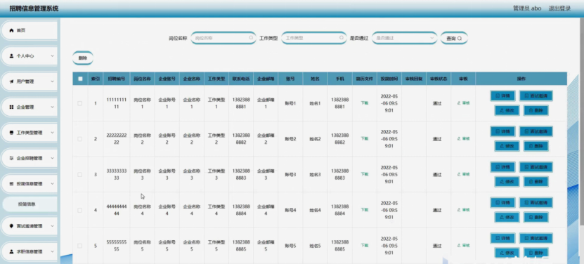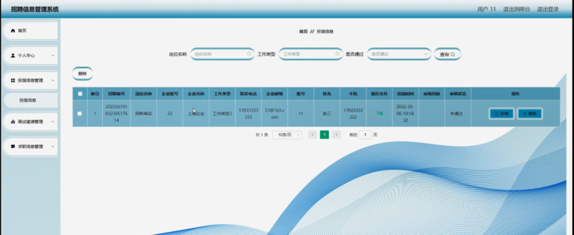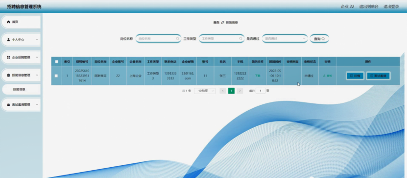 投简信息管理,在投简信息管理页面可以对索引、招聘编号、岗位名称、企业账号、企业名称、工作类型、联系电话、企业邮箱、账号、姓名、手机、简历文件、投简时间、审核回复、审核状态、审核等内容进行详情,面试邀请,修改或删除操作,如图5-11所示。