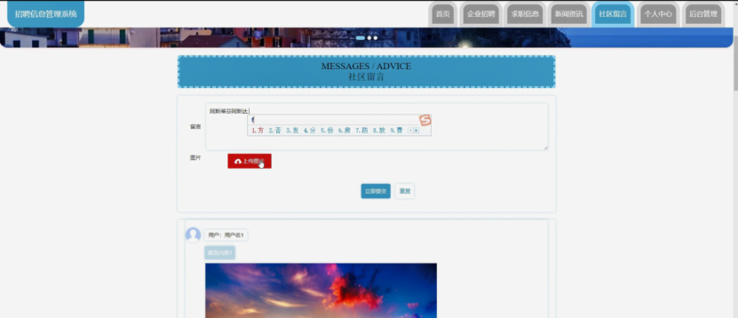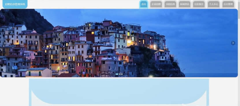 招聘信息管理系统,在系统首页可以查看首页、企业招聘、求职信息、新闻资讯、社区留言、个人中心、后台管理等内容进行详细操作,如图5-1所示。