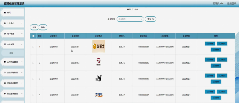 企业管理,在企业管理页面可以对索引、企业账号、企业名称、企业图片、联系人、联系电话、企业邮箱、企业地址等内容进行详情,修改和删除等操作,如图5-9所示。