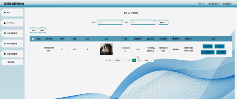 求职信息管理,在求职信息管理页面可以对索引、求职标题、账号、姓名、性别、照片、手机、期望薪资、岗位名称、工作地点、教育背景、获奖证书等内容进行详情,邀请面试,修改,查看评论或删除操作,如图5-13所示。